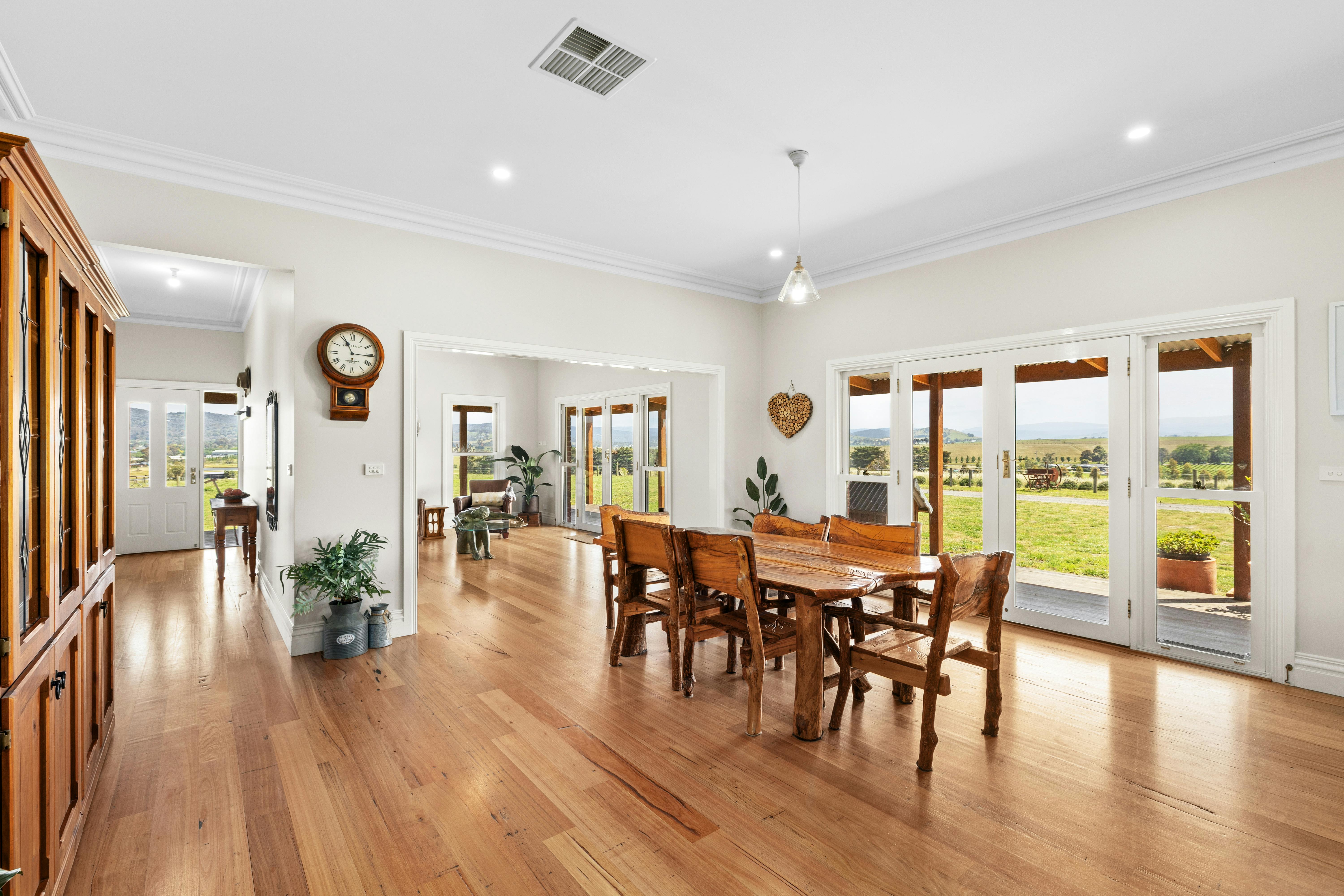 Elevated to capture its beautiful 360-degree views of the famous Yarra Valley, the substantial residence offers a flexible and welcoming floorplan with multiple living zones. The spacious modern kitchen presents timeless appeal, complete with a large timber island and large walk-in pantry. The kitchen flows seamlessly through to formal and informal dining spaces and to varied living spaces which feature beautiful timber flooring.